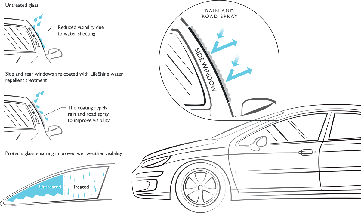 A glass treatment is professionally applied to the exterior of side and rear windows. It creates a water-repellent barrier that is highly durable, optically clear and easy to clean.