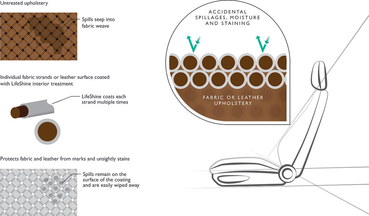 LifeShine’s interior treatment coats each and every strand of your car’s upholstery multiple times to create a barrier around fabric and leather. Spills and moisture are kept locked out of your car’s seating and carpets, and are easily wiped away if any accidents do occur.